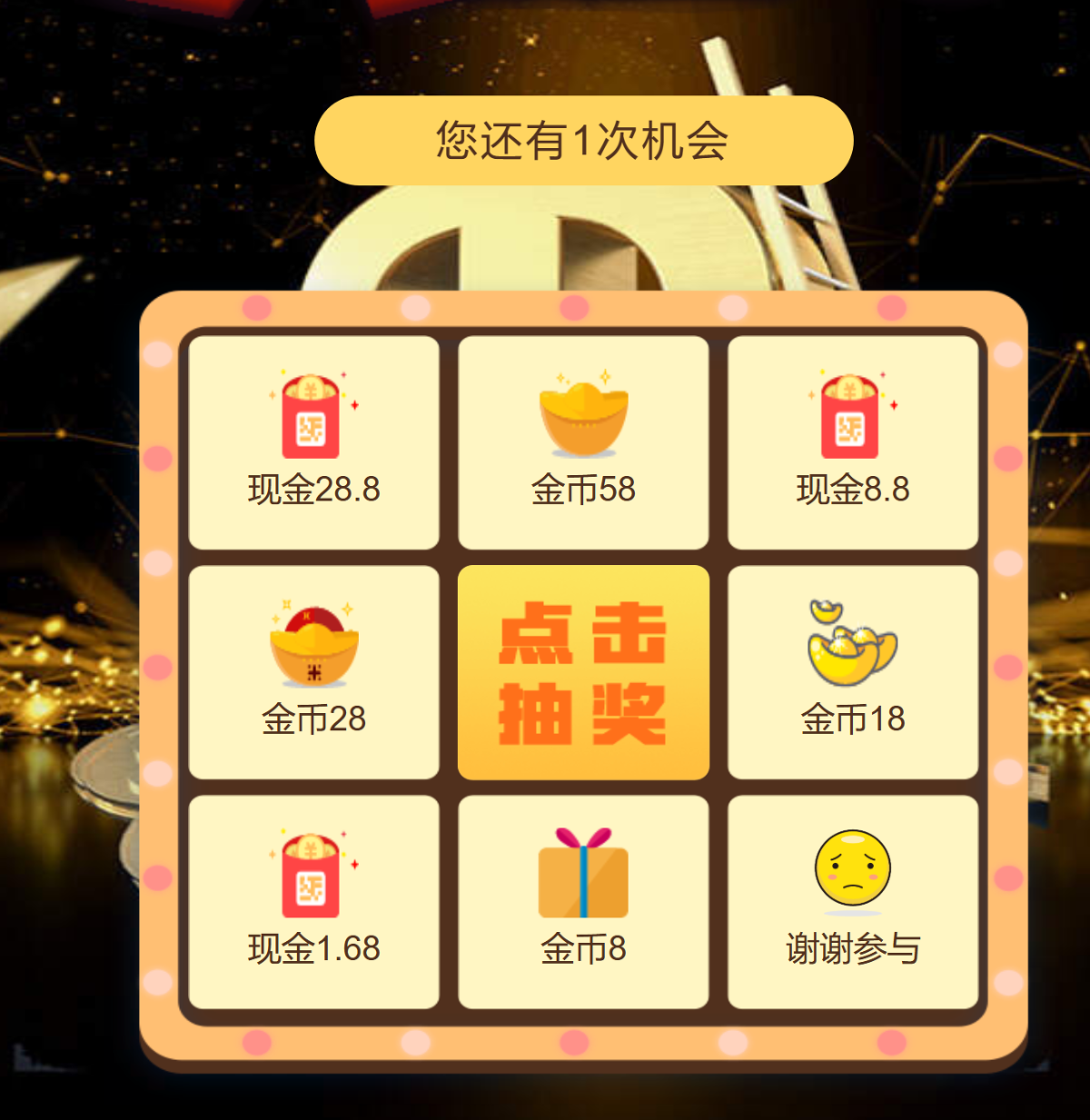 -可在抽奖中心抽奖,如猪脚饭、红牛、现金红包、金币等[每日可抽二次,免费一次,38金币一次]必须当天联系兑换领取