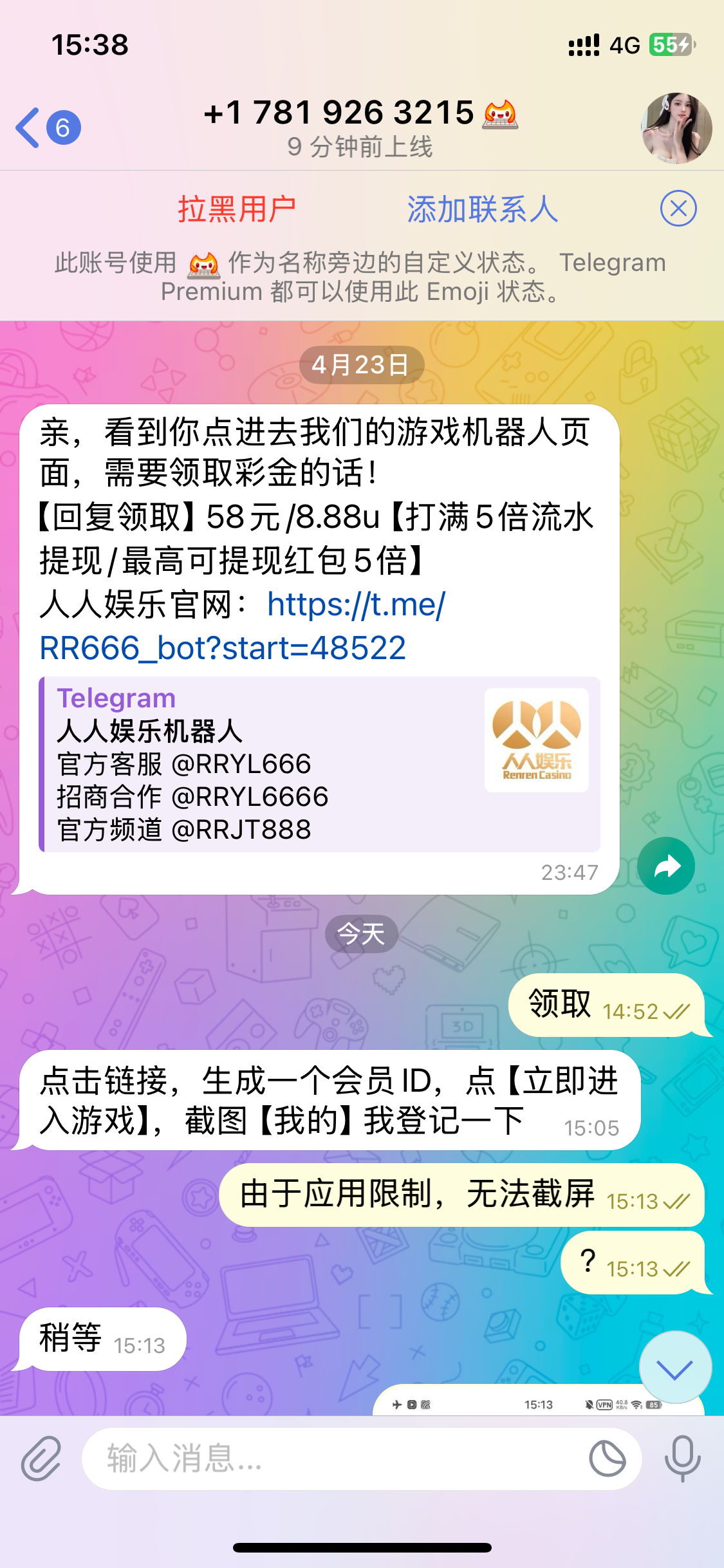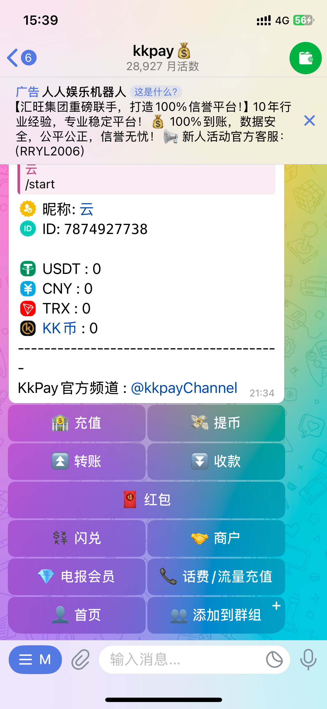 有飞机的可以点一下@kkpay 钱包置顶的人人娱乐广告点进去激活机器人,之后不用理会,会有专员私信问你要不要领取体验金,彩金限制电子5水,只能提彩金的5倍