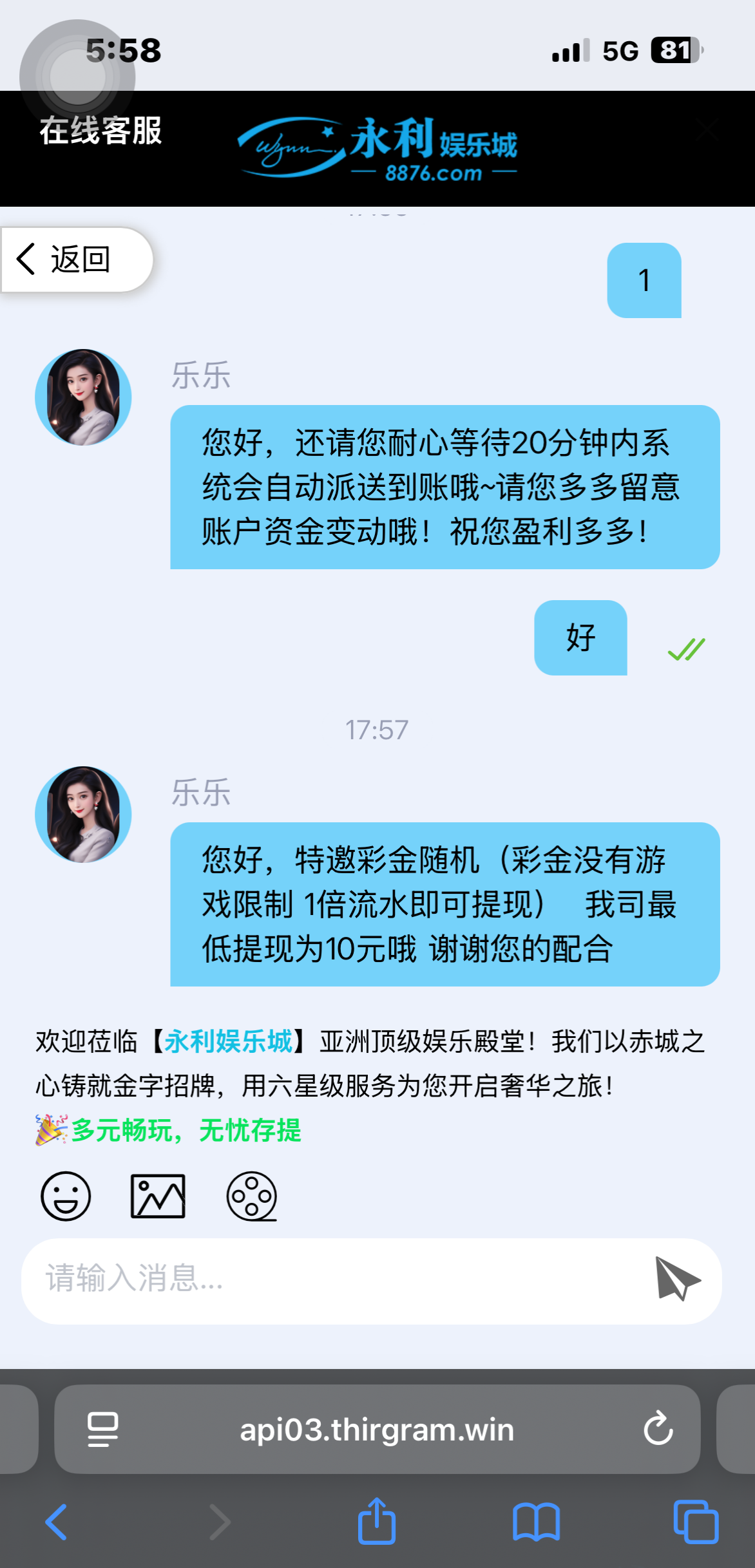 官网8876.com 找客服说领取电话彩金 不限制游戏 一倍水最低10块钱可以提 我接到电话的 可以去碰瓷